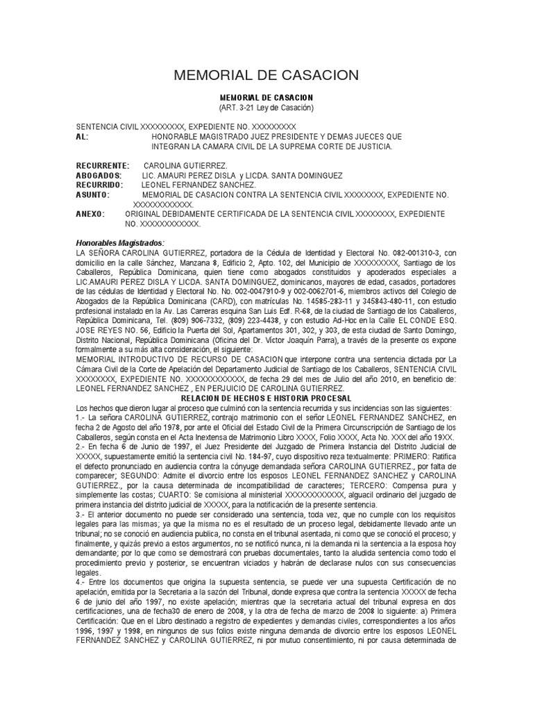 ASUNTO: MEMORIAL DE CASACION CONTRA LA SENTENCIA CIVIL XXXXXXXX, EXPEDIENTE NO.