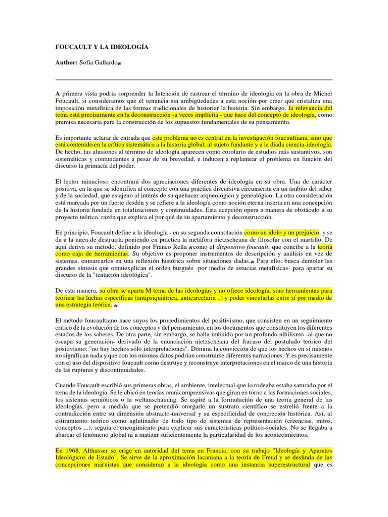 En este contexto, Foucault se aparta del trmino e ideologa. Empieza por hurgar en sus condiciones de