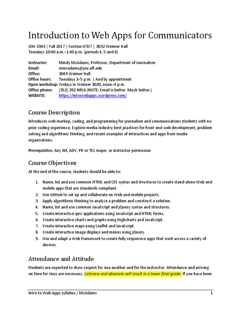 Introduces web markup, coding, and programming for journalism and communications students with no