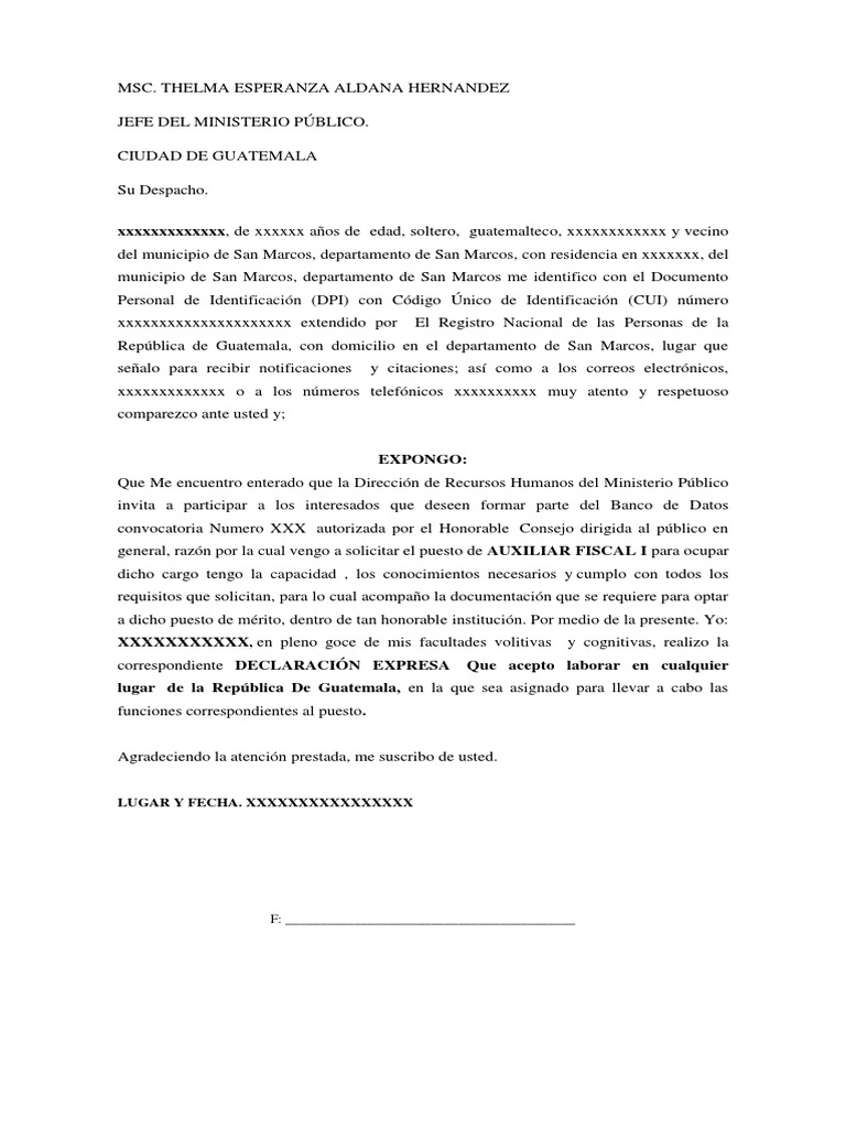 general, razn por la cual vengo a solicitar el puesto de AUXILIAR FISCAL I para ocupar