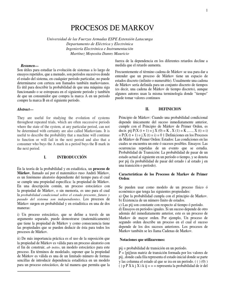 procesos de Mrkov. Markov tambin se les llama Cadenas de Markov.