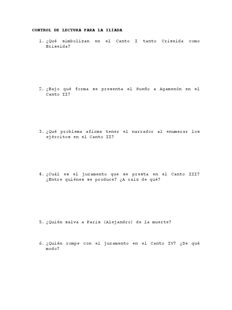 CONTROL DE LECTURA PARA LA ILADA