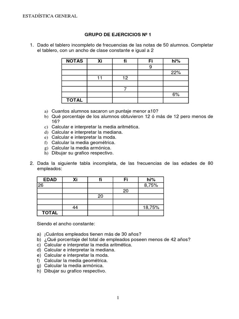 1. Dado el tablero incompleto de frecuencias de las notas de 50 alumnos. Completar