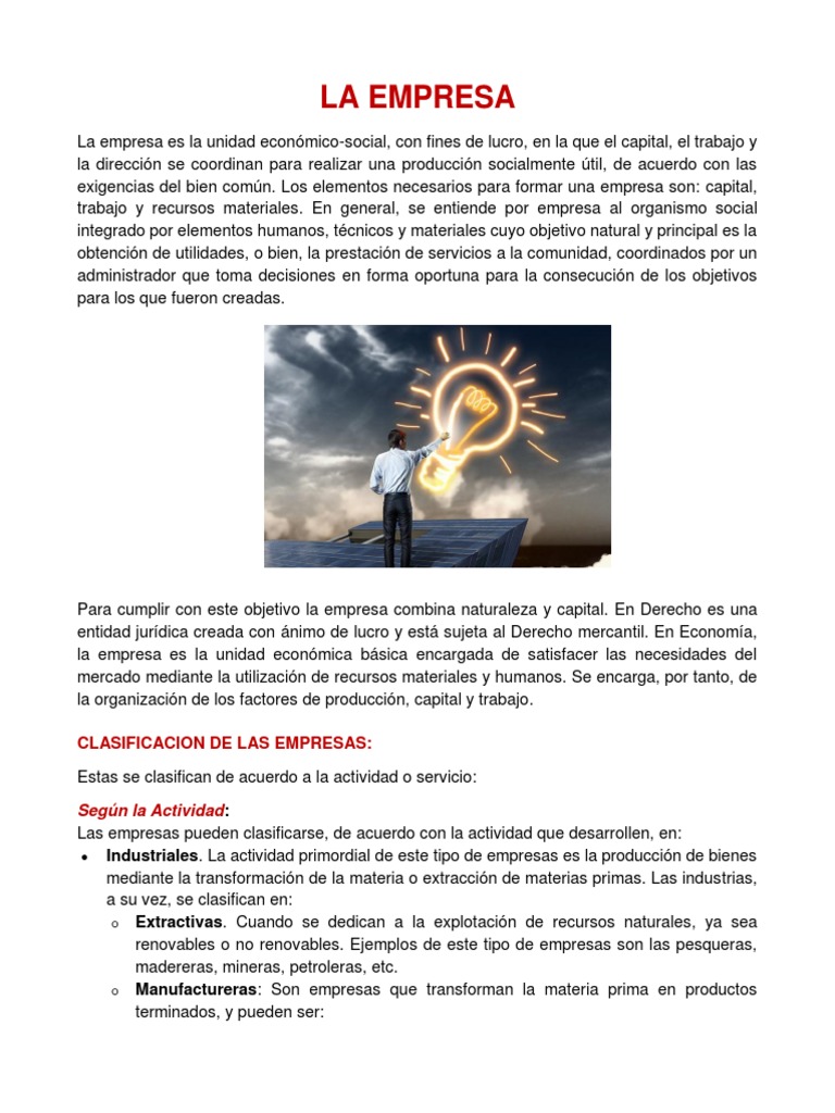 La empresa es la unidad econmico-social, con fines de lucro, en la que el capital, el trabajo y