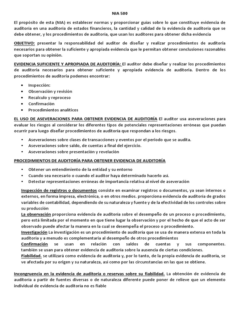 El propsito de esta (NIA) es establecer normas y proporcionar guas sobre lo que constituye evidencia de