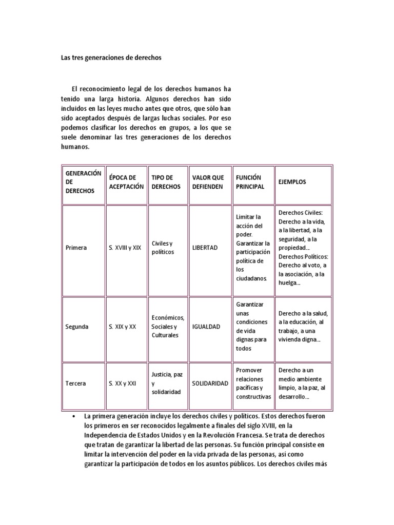 La primera generacin incluye los derechos civiles y polticos. Estos derechos fueron