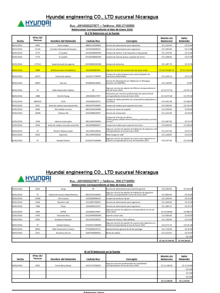 04/01/2016 0088 Multinversiones Inmobiliarias J0310000083061 Pago por servicio de construccin de obras civiles C$ 18,576,695.24 C$ 371,533.90