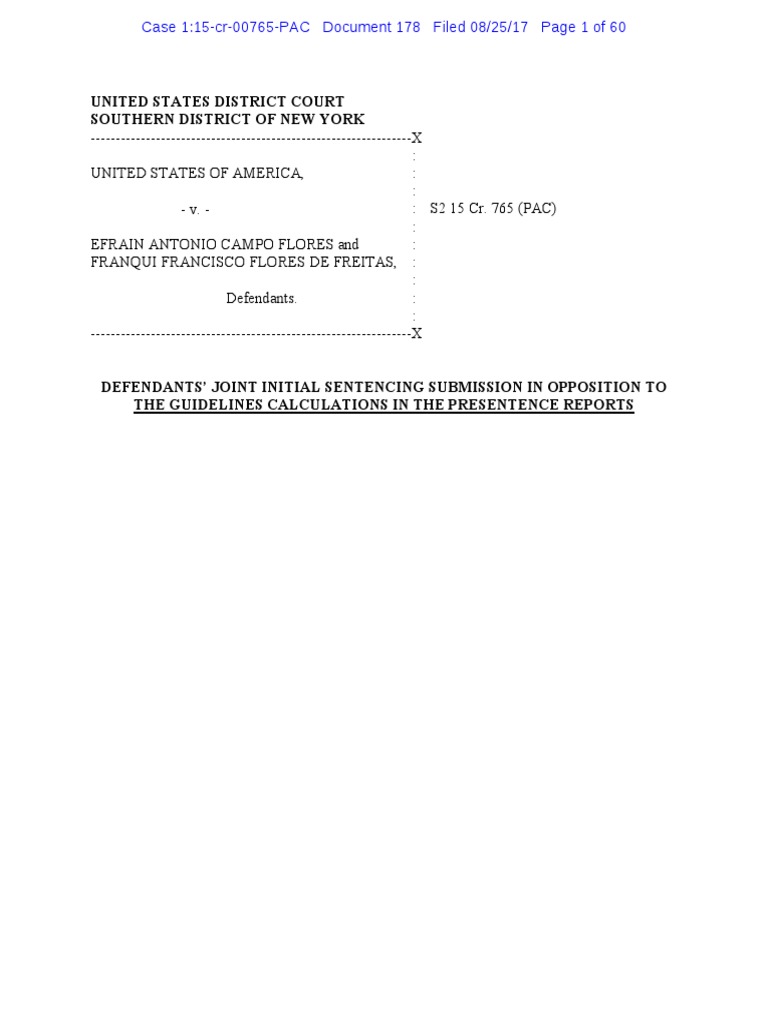 The document is the defendants' joint initial sentencing submission opposing the guidelines calculations in the presentence reports. It raises 10 arguments: 1) the drug quantity was overstated; 2) a leadership enhancement does not apply; 3) an aircraft enhancement does not apply; 4) an obstruction enhancement would contravene law; 5) a firearms enhancement has no basis; 6) a violence enhancement is unsupported; 7) a death enhancement would be inappropriate; 8) foreign uncharged conduct cannot support enhancements; 9) a bribery enhancement misinterprets the guidelines; and 10) the defendants are eligible for safety valve relief from the mandatory minimum.