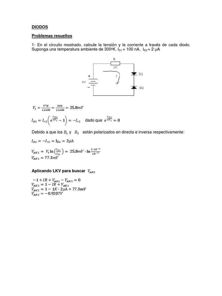 1- En el circuito mostrado, calcule la tensin y la corriente a travs de cada diodo.