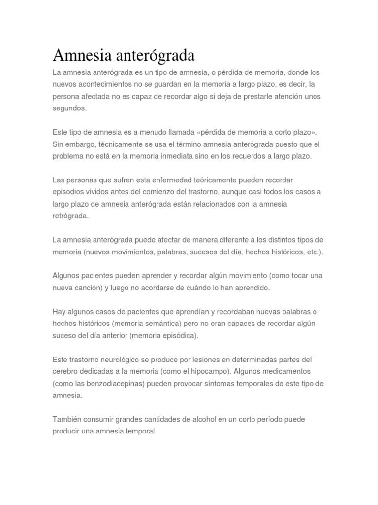 La amnesia antergrada es un tipo de amnesia, o prdida de memoria, donde los