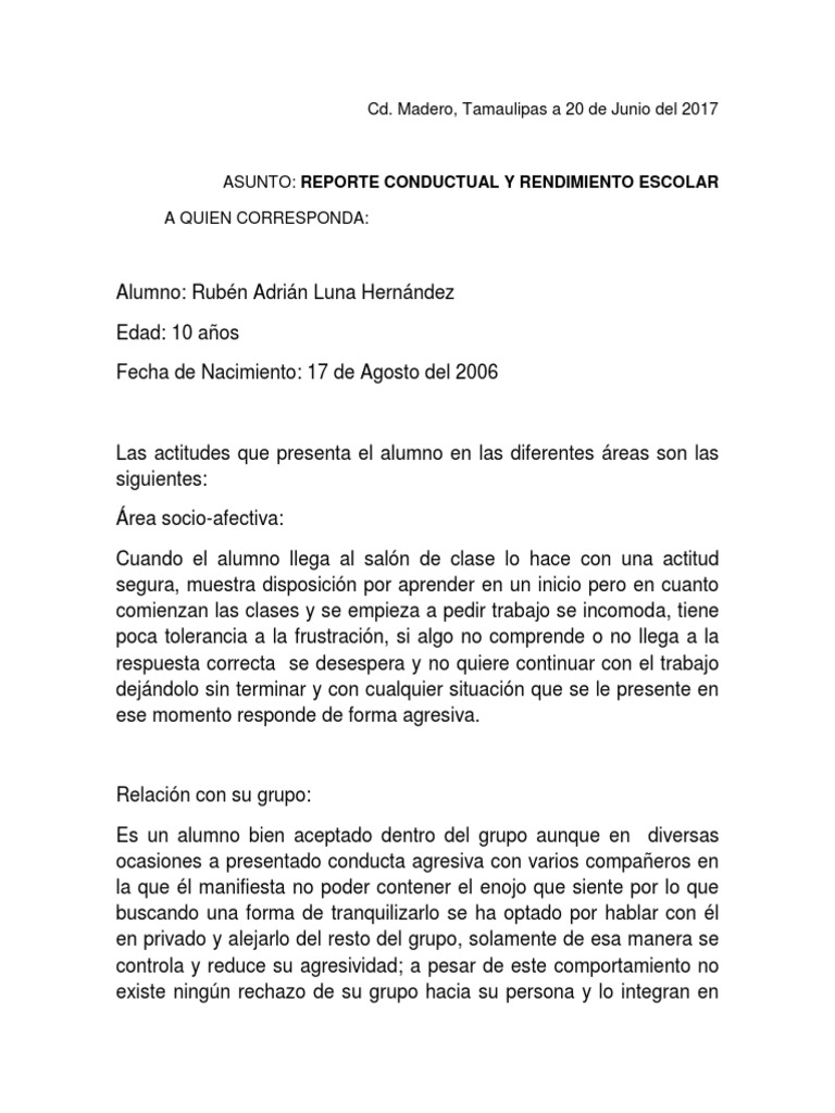 ASUNTO: REPORTE CONDUCTUAL Y RENDIMIENTO ESCOLAR