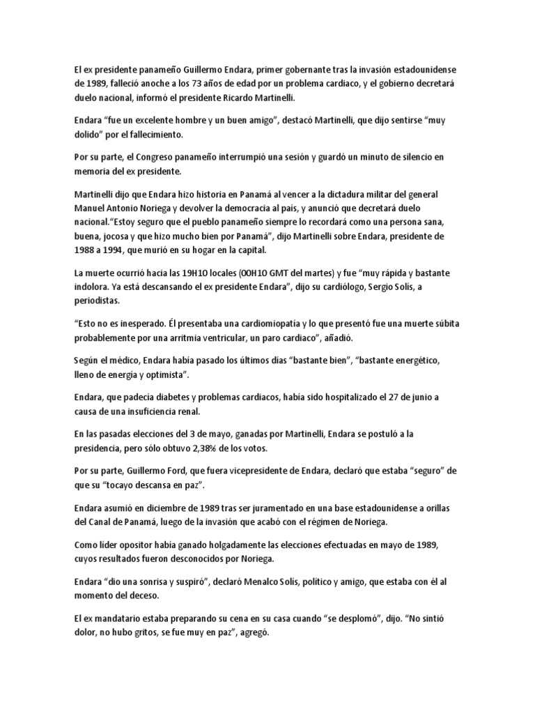 indolora. Ya est descansando el ex presidente Endara, dijo su cardilogo, Sergio Sols, a