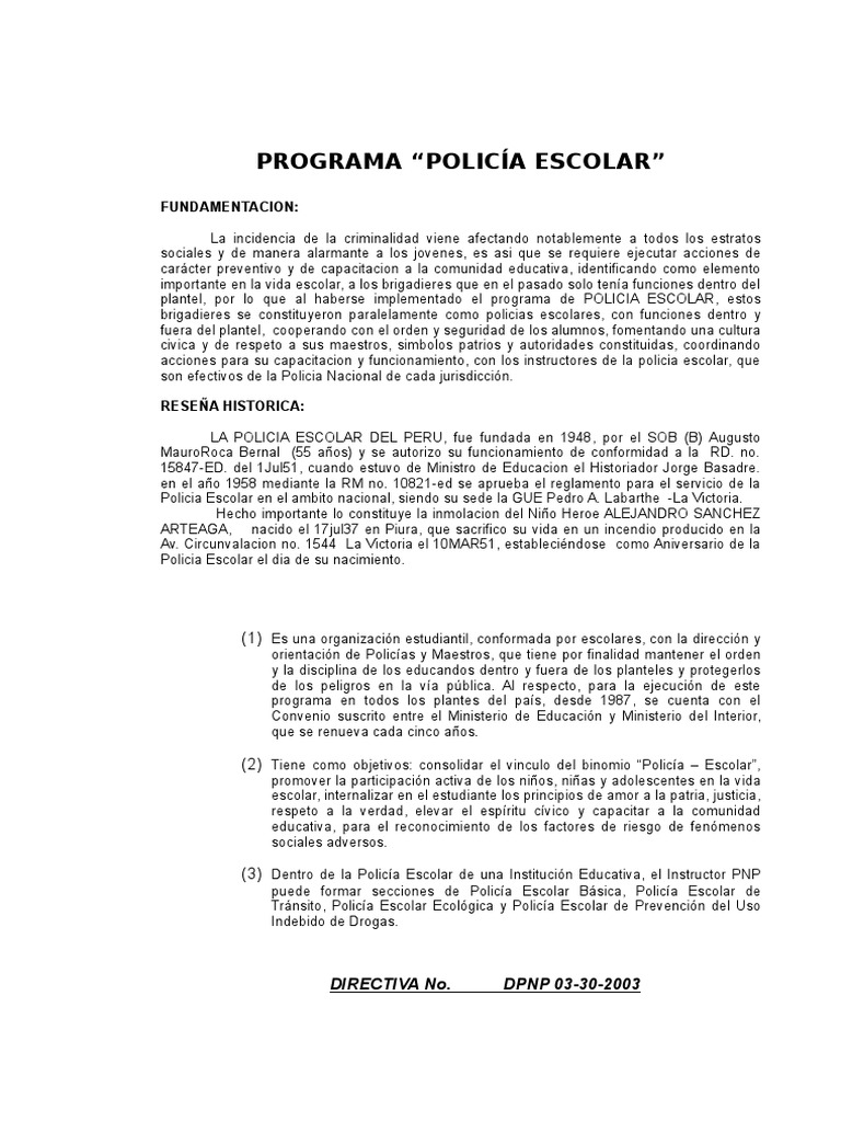 Directiva No. DPNP 03-30 de FEB2003, para la organizacin de la Polica Escolar por las