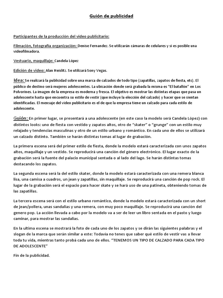 Idea: Se realizar la publicidad sobre una marca de calzados de todo tipo (zapatillas, zapatos de fiesta, etc). El