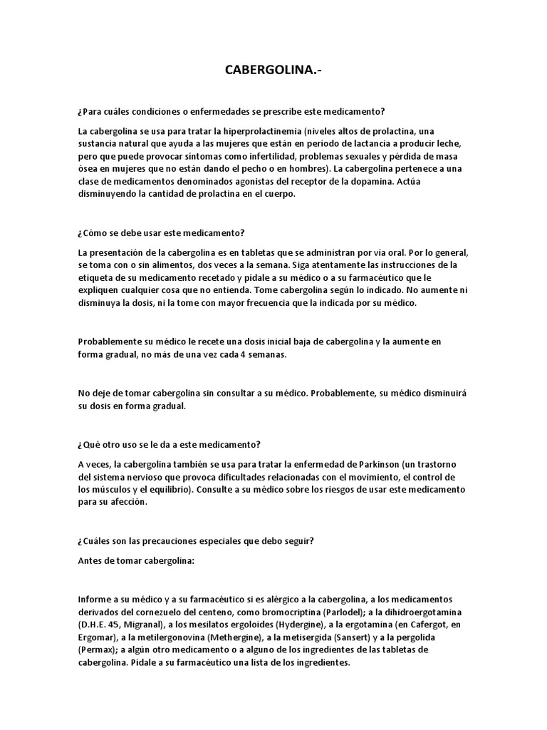expliquen cualquier cosa que no entienda. Tome cabergolina segn lo indicado. No aumente ni