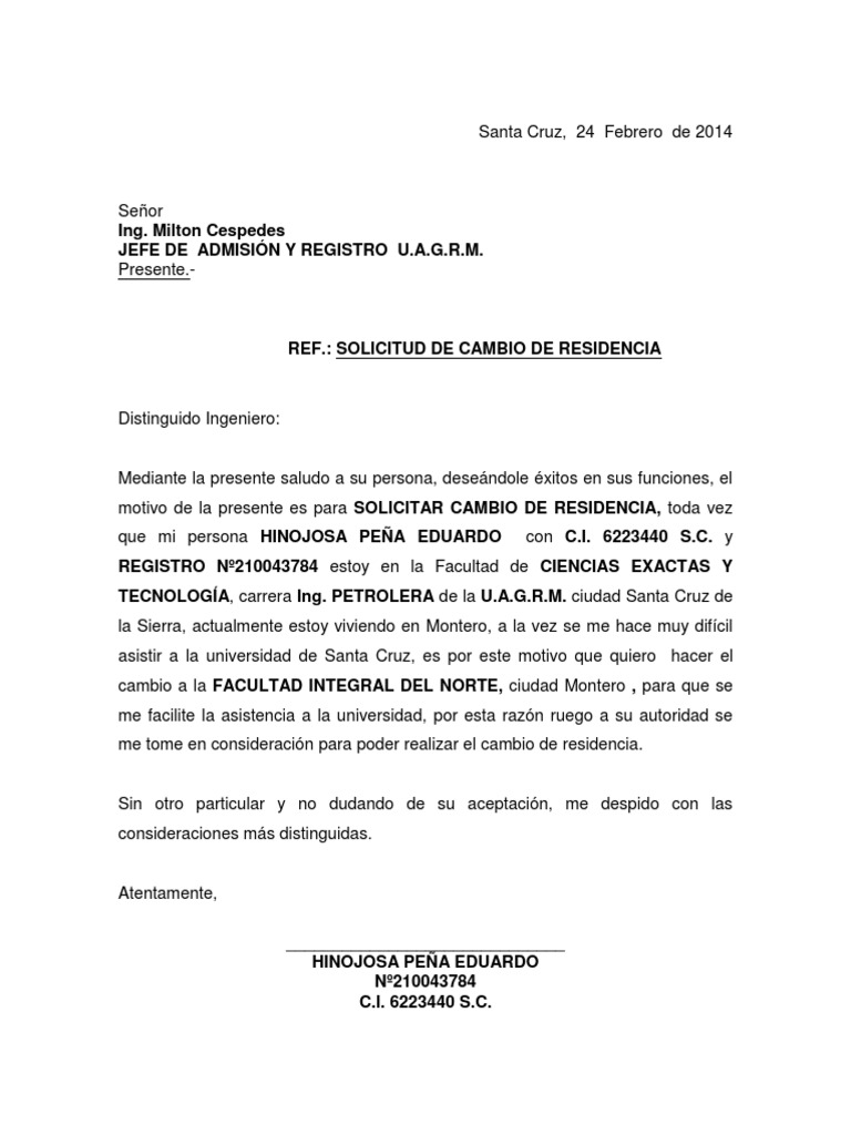 motivo de la presente es para SOLICITAR CAMBIO DE RESIDENCIA, toda vez