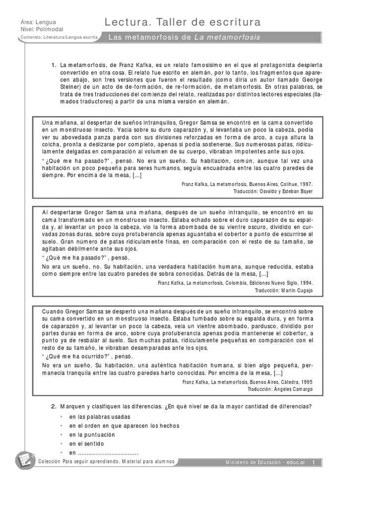 Contenido: Literatura/Lengua escrita Las metamorfosis de La metamorf o s i s