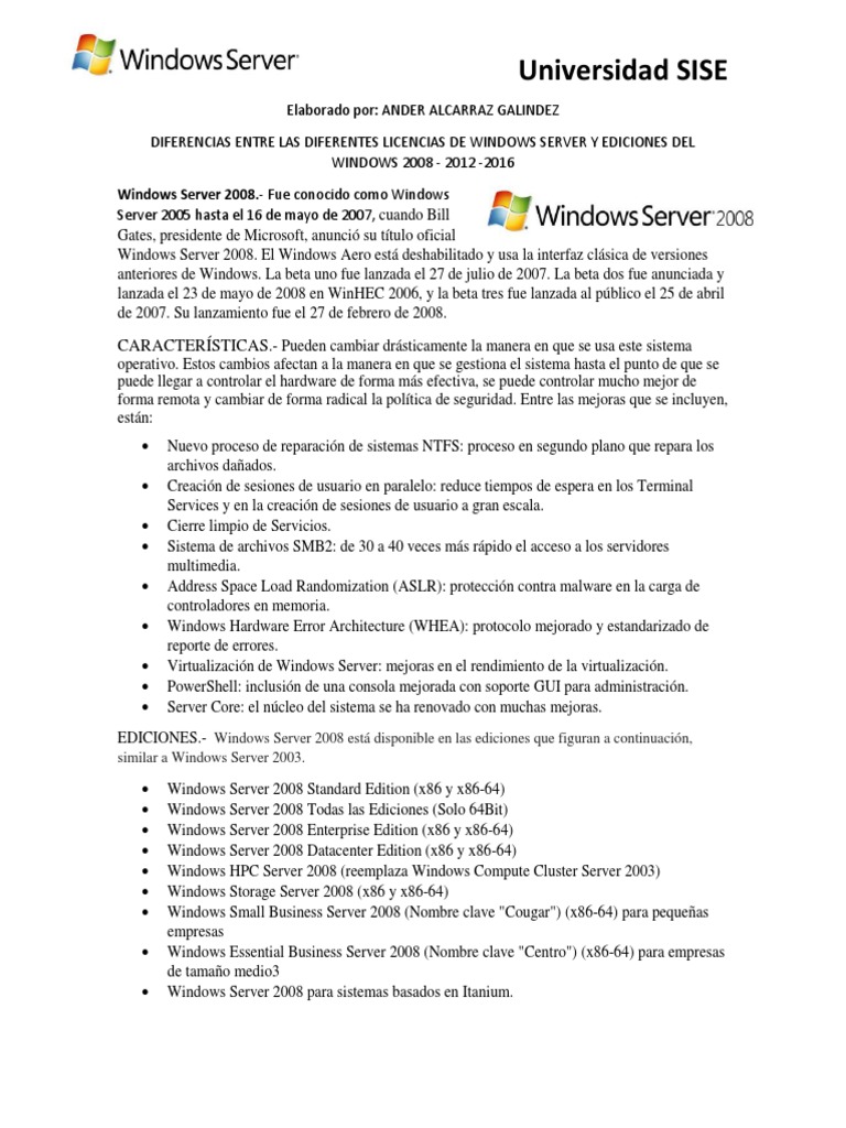 DIFERENCIAS ENTRE LAS DIFERENTES LICENCIAS DE WINDOWS SERVER Y EDICIONES DEL