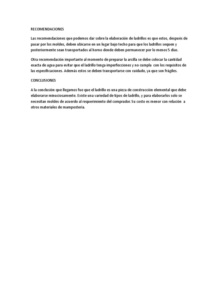 Las recomendaciones que podemos dar sobre la elaboracin de ladrillos es que estos, despus de