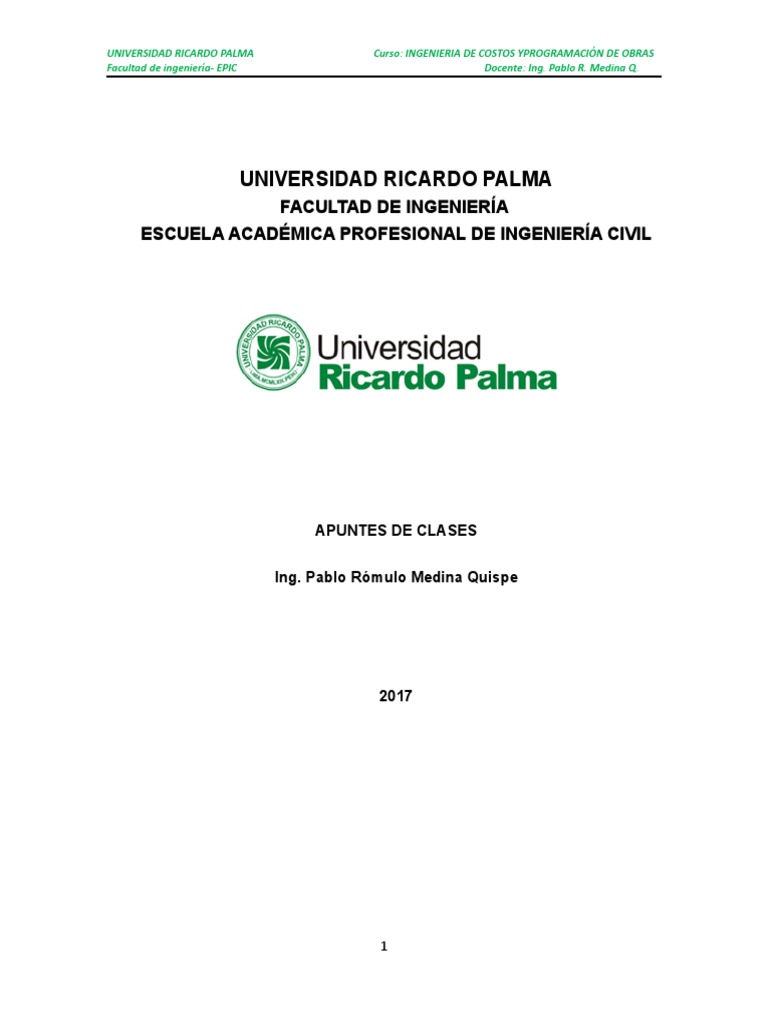 UNIVERSIDAD RICARDO PALMA Curso: INGENIERIA DE COSTOS YPROGRAMACIN DE OBRAS