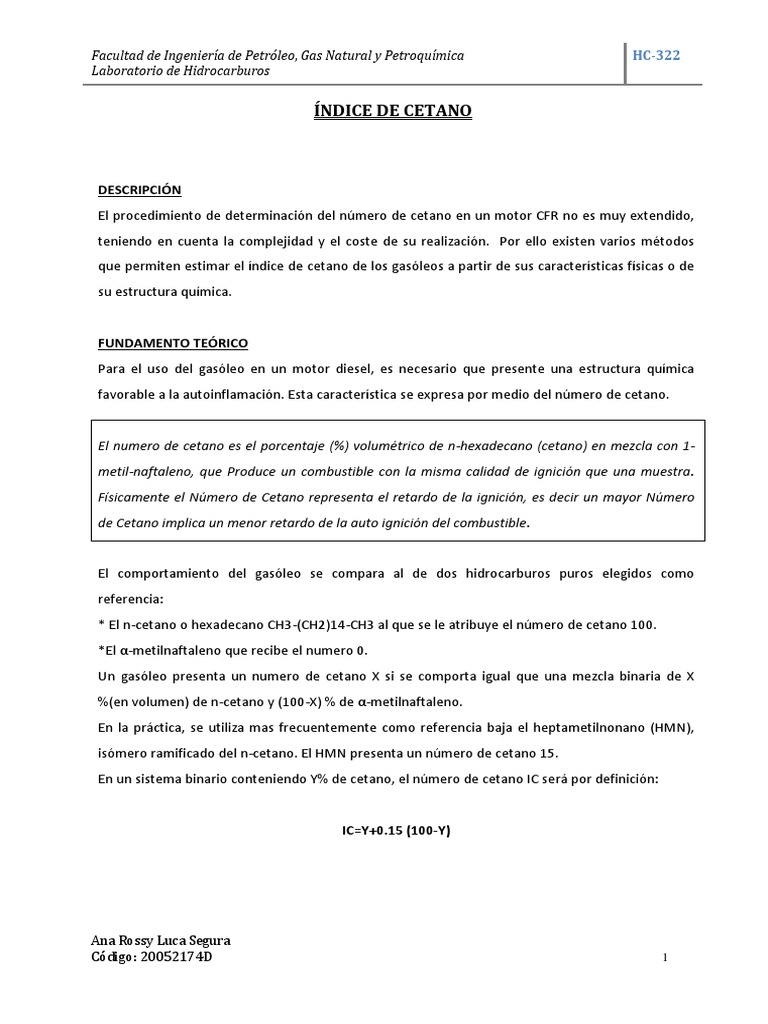 El numero de cetano es el porcentaje (%) volumtrico de n-hexadecano (cetano) en mezcla con 1-