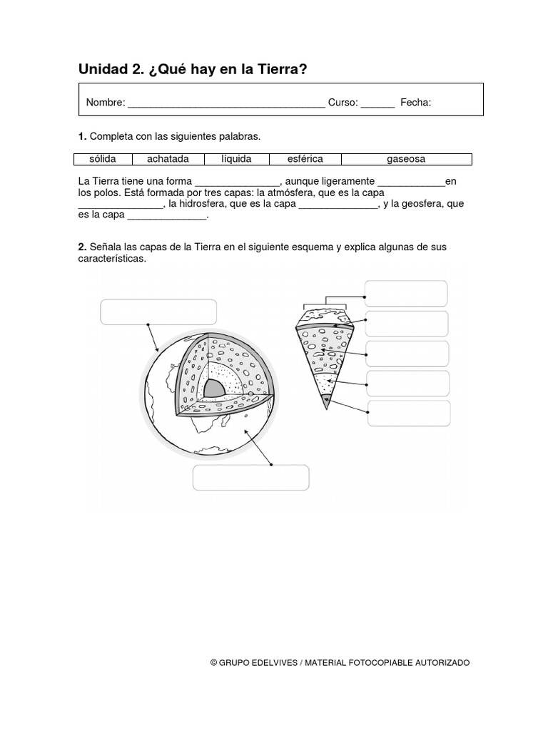 2. Seala las capas de la Tierra en el siguiente esquema y explica algunas de sus