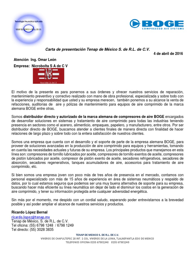 Carta de presentacin Tenap de Mxico S. de R.L. de C.V.