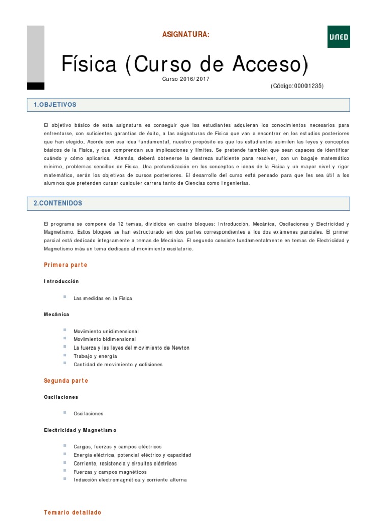 El programa se compone de 12 temas, divididos en cuatro bloques: Introduccin, Mecnica, Oscilaciones y Electricidad y