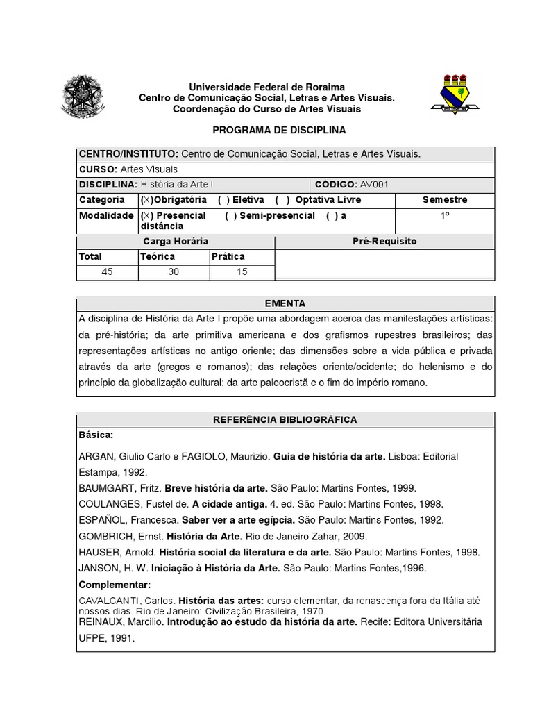 DISCIPLINA: Histria da Arte I CDIGO: AV001