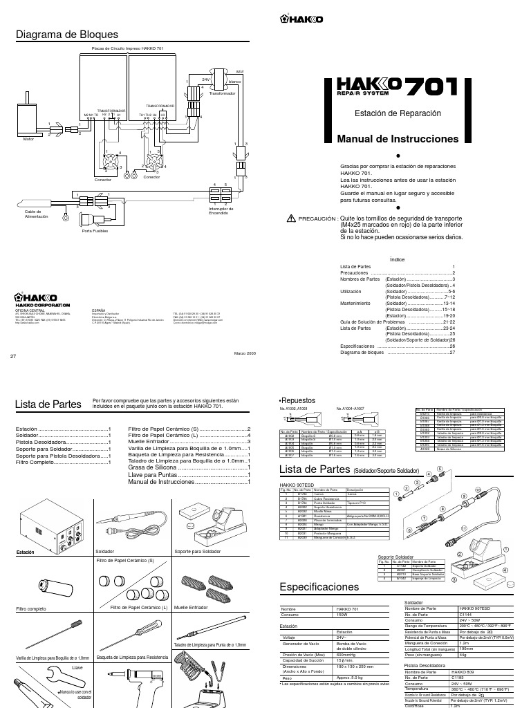 Lista de Partes incluidos en el paquete junto con la estacin HAKKO 701. No. A1002, A1003 No. A1004~A1007 No. de Parte Nombre de Parte / Especificacin