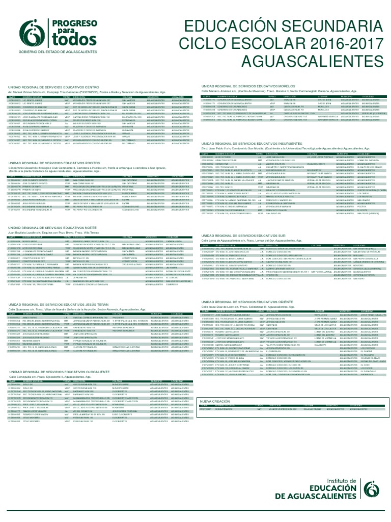 01DTV0016W ETV NUM. 16, MIGUEL HIDALGO J.A. AVENIDA DEL PARQUE SN CALVILLO PRESA DE LOS SERNA 01DTV0164E ETV NUM. 164, E. OLIVARES SANTANA J.A. FRANCISCO I. MADERO NUM. 502 PAB. DE ARTEAGA SAN LUIS DE LETRAS