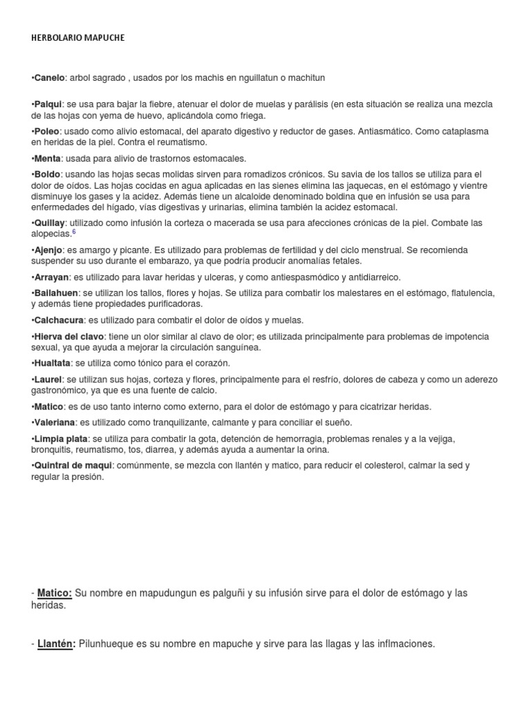 - Llantn: Pilunhueque es su nombre en mapuche y sirve para las llagas y las inflmaciones.