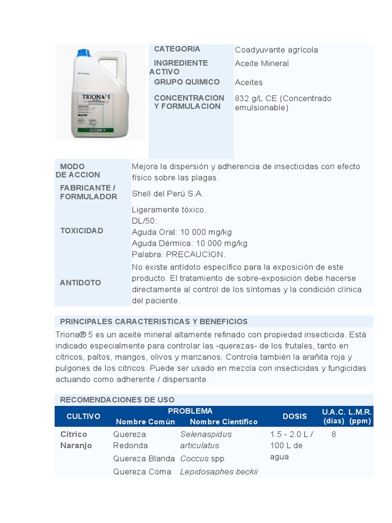 Triona 5 es un aceite mineral altamente refinado con propiedad insecticida. Est