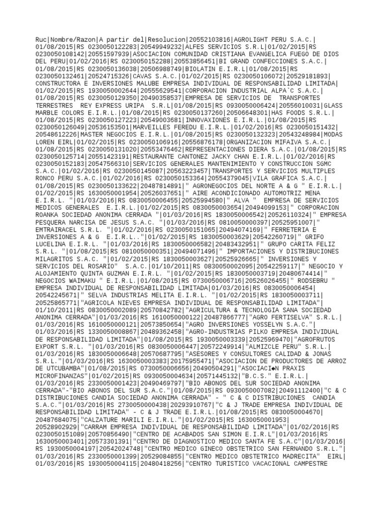 E.I.R.L|01/02/2016|RS 0230050150047|20101928200|ZR INTEX S.A.C.|01/02/2015|RS