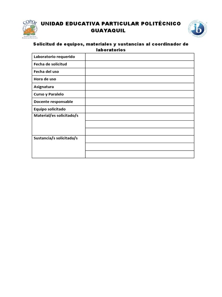 Este documento es una solicitud para el uso de equipos, materiales y sustancias de laboratorio en una escuela politécnica en Guayaquil. Contiene espacios para especificar el laboratorio requerido, las fechas y horas de uso, la asignatura, curso y docente responsable, y los equipos, materiales y sustancias solicitados.
