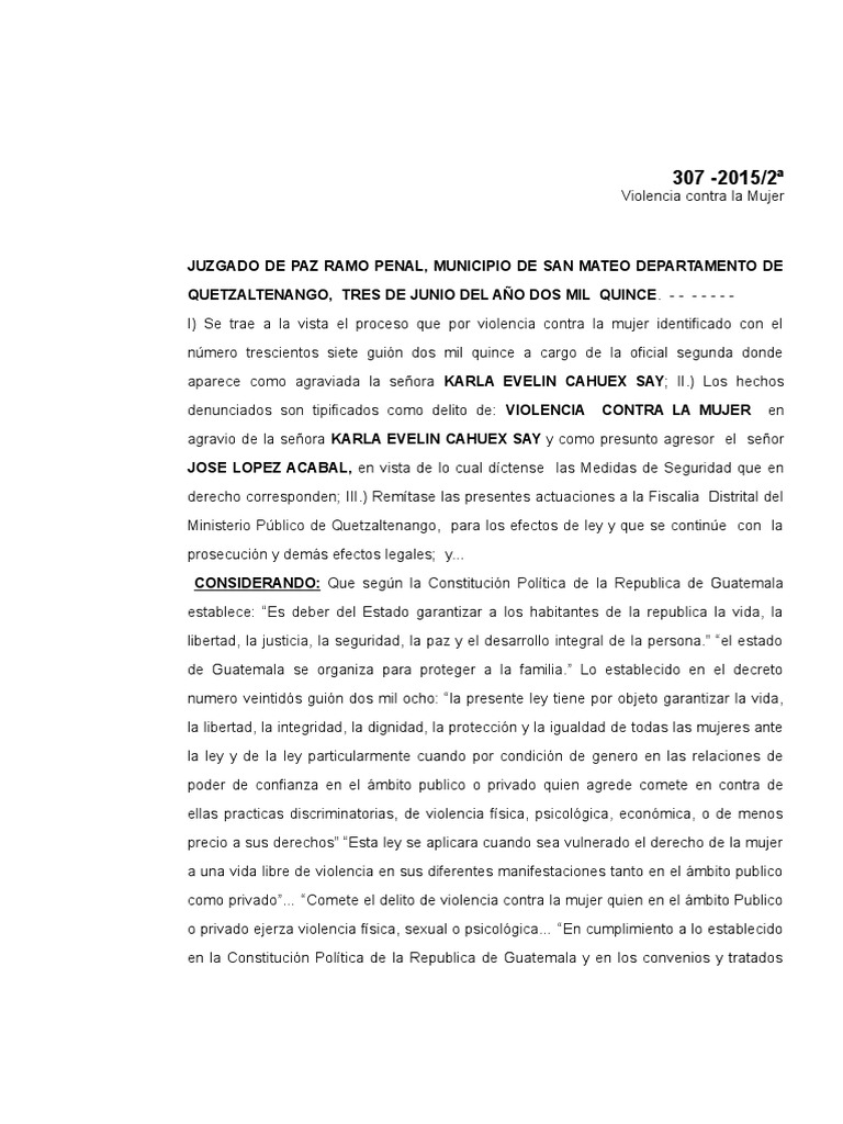 de la Republica de Guatemala; 1, 2, 7, 12 de la Ley contra el Femicidio y otras formas de