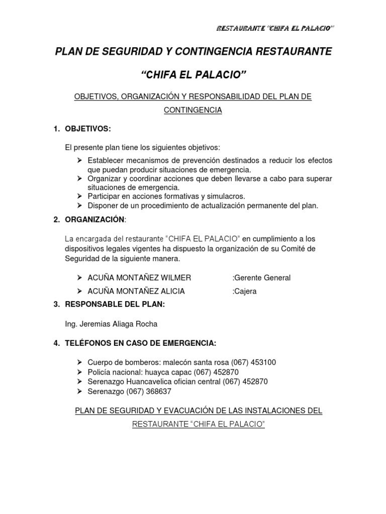 PLAN DE SEGURIDAD Y CONTINGENCIA RESTAURANTE