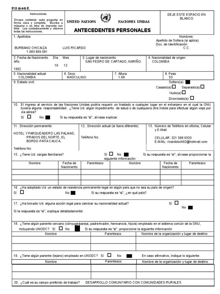 19. Tiene algn pariente (lejano) empleado en UNODC? S No xxxEn caso afirmativo, indique lo siguiente:
