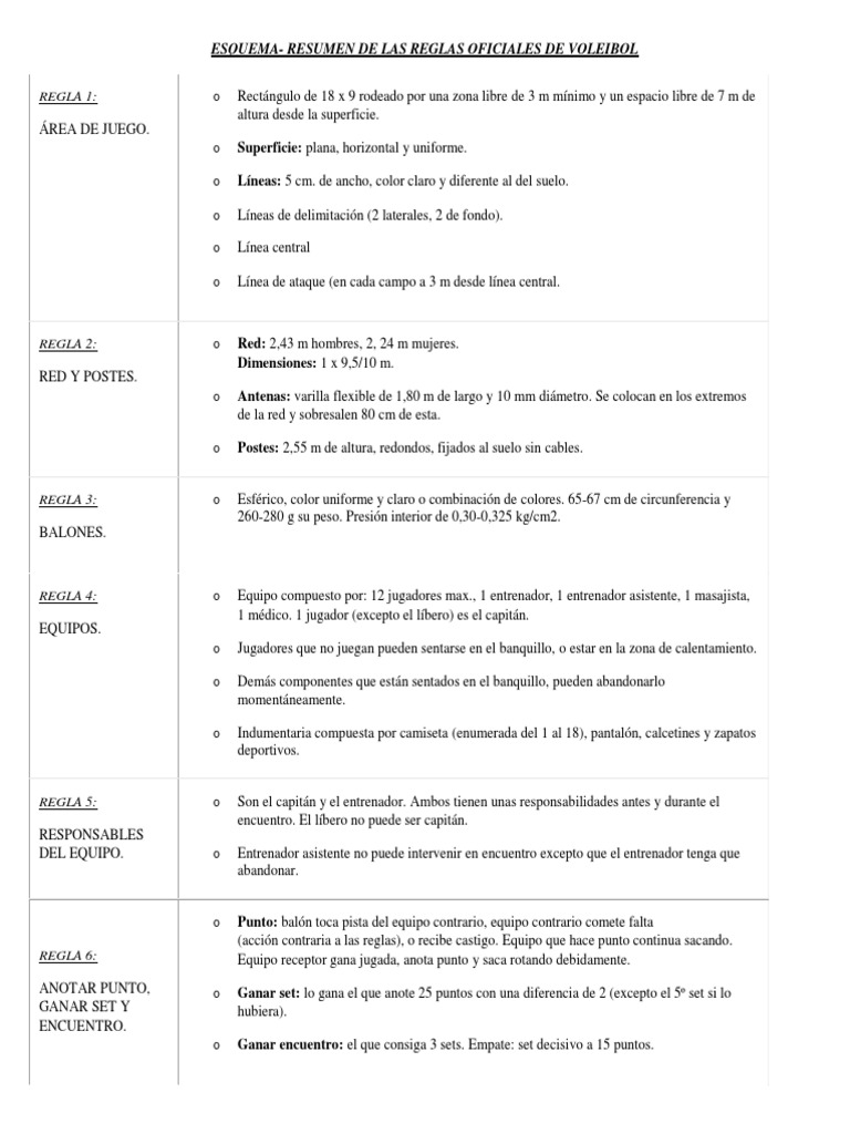 ESQUEMA- RESUMEN DE LAS REGLAS OFICIALES DE VOLEIBOL