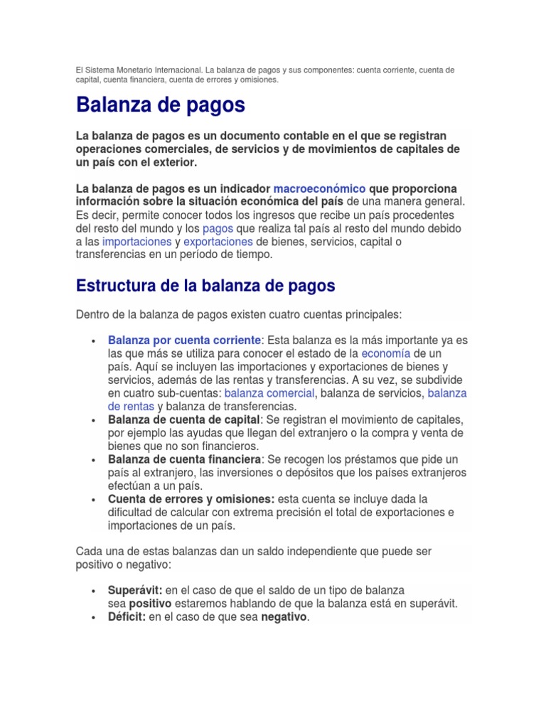 La balanza de pagos y sus componentes: cuenta corriente, cuenta de