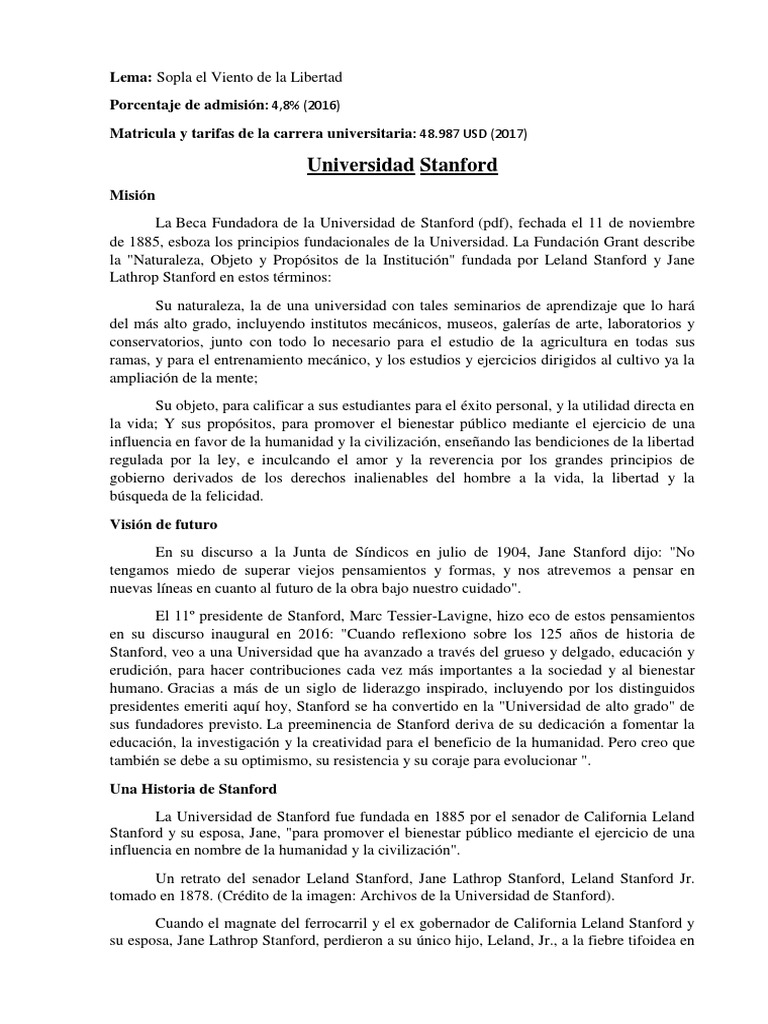 la "Naturaleza, Objeto y Propsitos de la Institucin" fundada por Leland Stanford y Jane