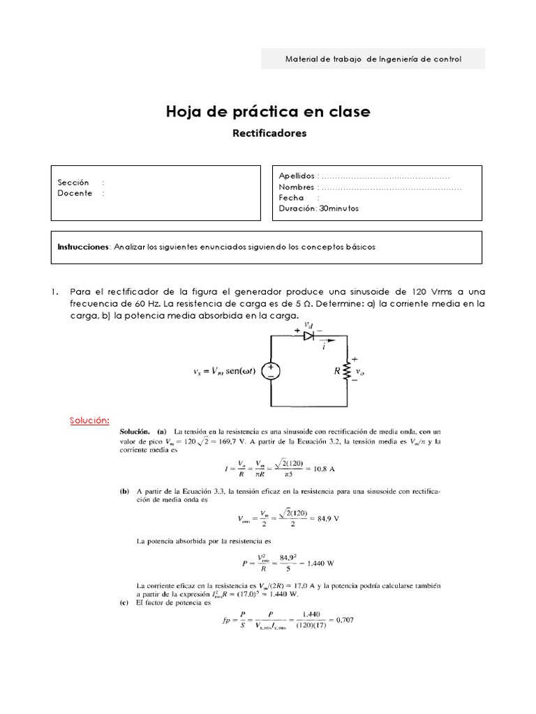 frecuencia de 60 Hz. La resistencia de carga es de 5 . Determine: a) la corriente media en la