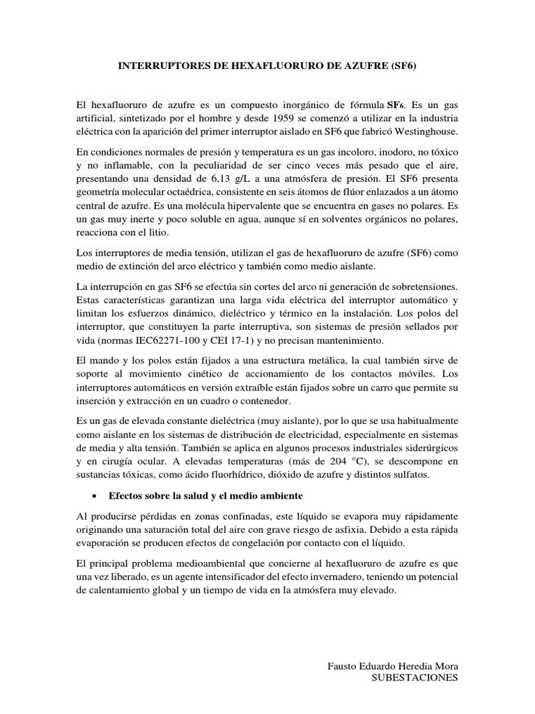 Los interruptores de media tensin, utilizan el gas de hexafluoruro de azufre (SF6) como