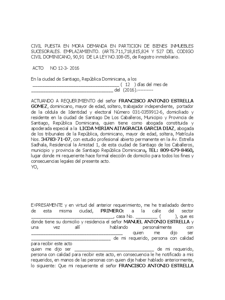 de cómoda división en naturaleza. de todo lo cual doy fe y certifico. QUINTO: Poner las costas a cargo de la masa a partir declarándolas privilegiadas en relación a cualquier otro gasto. frente a los derechos de las partes. CUARTO: Que designéis un perito. por haber sido hecha conforme a las normas procesales que rigen sobre la materia. JOSE ENRIQUE ESTRELLA. liquidación y partición de los bienes inmuebles descritos mas arriba. conforme al Pliego de Condiciones que será depositado en Secretaría por los abogados de los requerientes y después del cumplimiento de todas las formalidades legales. a persecución del señor FRANCISCO ANTONIO ESTRELLA GOMEZ y en presencia de los requeridos o ellos debidamente citados se ordene la partición y liquidación de los bienes inmuebles descritos mas arriba. copia del presente acto. por ante el cual tengan lugar las operaciones de cuenta. ELIGIO FELIX ESTRELLA. . FELIX ANTONIO ESTRELLA. informe que los mismos deben ser vendido a persecución de los requerientes. para que previamente a estas operaciones examine los inmuebles descritos mas arriba. NERCIDA DOLORES ESTRELLA. haga la designación sumaria de los inmuebles e informe si los mismos son o no. si no hay oposición. AGUEDA MARIA ESTRELLA. propiedad del señor FELIX ANTONIO ESTRELLA GUTIERREZ. FELIX RADHAME ESTRELLA. el cual después de prestar el juramento de ley en presencia de todas las partes o éstas debidamente llamadas. en audiencia de pregones. y si la hubiere condenar al oponente al pago de las mismas en distracción a favor del LICDA. Costo: RD$ __________ DOY FE EL ALGUACIL. Bajo toda clase de reservas. LUIS ALFONSO ESTRELLA. propiedad del fallecido señor FELIX ANTONIO ESTRELLA GUTIERREZ y a la formación y sorteo de los lotes. en pública subasta. de este tribunal y adjudicado al mayor postor y último subastador. SEGUNDO: Ordenar que. y en caso afirmativo. así se lo notifico.que desconozcan los demandantes. REINALDO RAFAEL ESTRELLA. ELIDA DE JESUS ESTRELLA. RAFAEL APOLINAR ESTRELLA. MANUEL ANTONIO ESTRELA AQUINO. y designéis un Notario de ese Municipio. que consta de Cinco (5) páginas. ANACELIA ESTRELLA. determine estas partes. o si los inmuebles no se pueden dividir en naturaleza. MIRIAN ALTAGRACIA GARCIA DIAZ quien afirma estarlas avanzando en su mayor parte. que firmo. JOAQUIN BAITOLO ESTRELLA no lo ignoren. I a fin de que mis requeridos los sres. TERCERO: Que vos se auto designéis Juez Comisionario. en las formas prescritas por la ley. dejando entre las manos de las personas con la cual hablo. y en caso negativo fijen los lotes mas ventajosos así como el valor de cada uno de los lotes destinados a venderse en pública subasta. sello y rubrico tanto en su original como en cada una de sus copias útiles.