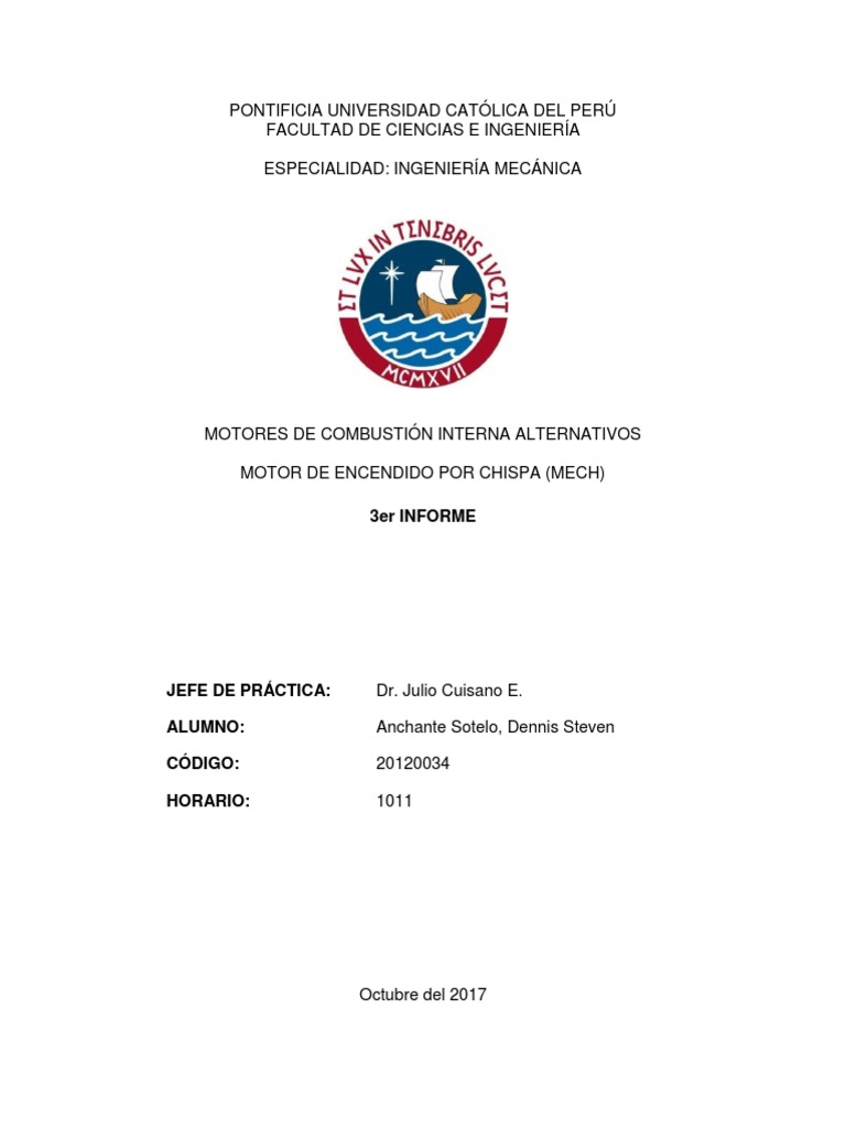 0118 0.0641 0.8 18.8 645.2 794.8 77.20 1.0 52.0100 0.9 2.0767 0.𝒓𝒆𝒇 0.7 𝑲 17 .𝑰𝑺𝑶 36.0163 0.59 0. 1 2 3 4 5 6 7 8 9 - TORQUE.9749 0.0641 0.9 28.0641 0.8 % FACTOR LAMBDA Dosado estequiométrico 𝑭𝒆 0.7 337.0689 0.9 798.20 1.0 % FLUJO DE AIRE Y RENDIMIENTO VOLUMETRICO Densidad del aire 𝝆𝒂 1.0136 0.0176 0.2 10.9 56.5 780.2 65.1 16.25 0.7 𝒌𝑾 Trabajo efectivo 𝑾𝒆.6 4.6 16.CIENCIAS E INGENIERÍA Tabla 7: Resultados del Ensayo a carga parcial Parámetros Símbolo Valor Unidades RPM 2000 3000 4000 Punto .0238 0.4 5.9 19.3 13.8 27.05 - Factor lambda 𝝀 1.0335 0.6 789.16 0.05 0.03 0.6 11.1 𝒃𝒂𝒓 𝒈 Consumo específico de combustible 𝒄𝒆𝒄𝑰𝑺𝑶 229.20 1.𝑰𝑺𝑶 12.65 0.3 1.0167 0.0641 0.0083 0.07 1.20 𝒌𝒈/𝒎𝟑 Flujo volumétrico de aire 𝑽𝒂 0.0561 0.9749 0.7 278.0 433.7 5.0058 0.2 68.7 34.0641 0.6 𝑵.2 79.5 3.36 0.0048 0.0100 0.9749 0.0234 0.86 1.49 0.1 17.0641 0.73 1.0153 𝒌𝒈/𝒔 Flujo másico de aire de referencia 𝒎 𝒂.3 1.34 0.5 19.0553 0.84 0.9 444.9 1.0258 0.95 - MÁXIMAS TEMPERATURA Y PRESIÓN TEÓRICAS DURANTE LA COMBUSTIÓN Temperatura al final de la compresión 𝑻𝟐 787.9749 - Torque corregido 𝑻𝑰𝑺𝑶 58.3 787.0612 0.7 290.0232 𝒌𝒈/𝒔 Rendimiento volumétrico 𝜼𝒗 59.20 1.0671 - Dosado relativo 𝑭𝒓 0. 𝒉 Rendimiento efectivo 𝜼𝒆. .3 8.20 1. 𝒎 Potencia efectiva 𝑵𝒆.3 13.93 0.9749 0.5 51.20 1.0641 0.5 39. 75% 50% 25% 75% 50% 25% 75% 50% 25% - Factor de corrección 𝜶𝒂 0.0620 0.0186 0.1 24.3 2.0215 0.9749 0.0641 - Dosado absoluto 𝑭 0.88 0.3 773.14 1.7 𝒌𝑾.8 30.7 776.5 46.74 0.84 1.43 0.0111 0.2 4.5 65.18 0.20 1.97 1.6 495.0280 0.95 1.0293 0.0154 0.9 69.9749 0.20 1.9749 0.17 𝒌𝑱 Presión media efectiva 𝒑𝒎𝒆𝑰𝑺𝑶 4.9749 0.22 0.0224 0.4 24.0127 𝒎𝟑/𝒔 Flujo másico de aire 𝒎 𝒂 0.0 19.0141 0.0874 0.9 3.2 781.0200 0.20 1.0641 0.0759 0.3 339.𝑰𝑺𝑶 0.0083 0. POTENCIA Y PRESION MEDIA SEGÚN ISO %Torque máx.