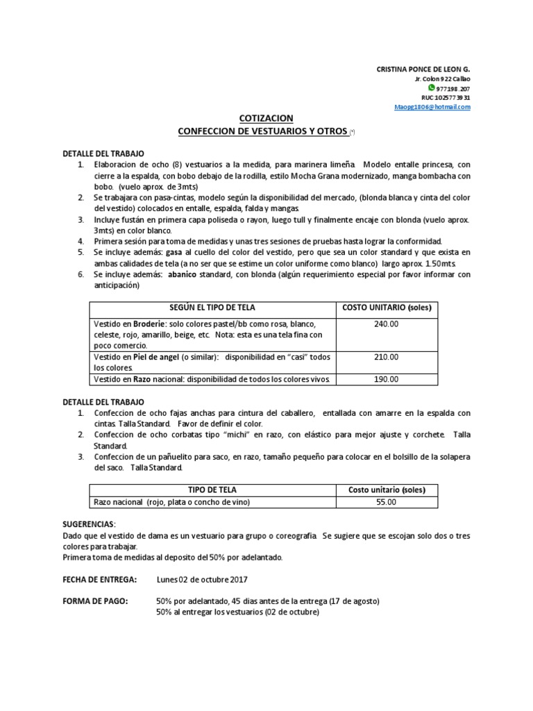 FORMA DE PAGO: 50% por adelantado, 45 dias antes de la entrega (17 de agosto)