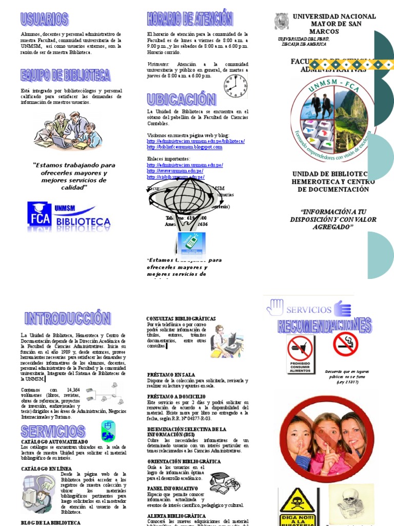 UNMSM, as como usuarios externos, son la 9.00 p.m., y los sbados de 8:00 a.m. a 6.00 p.m.