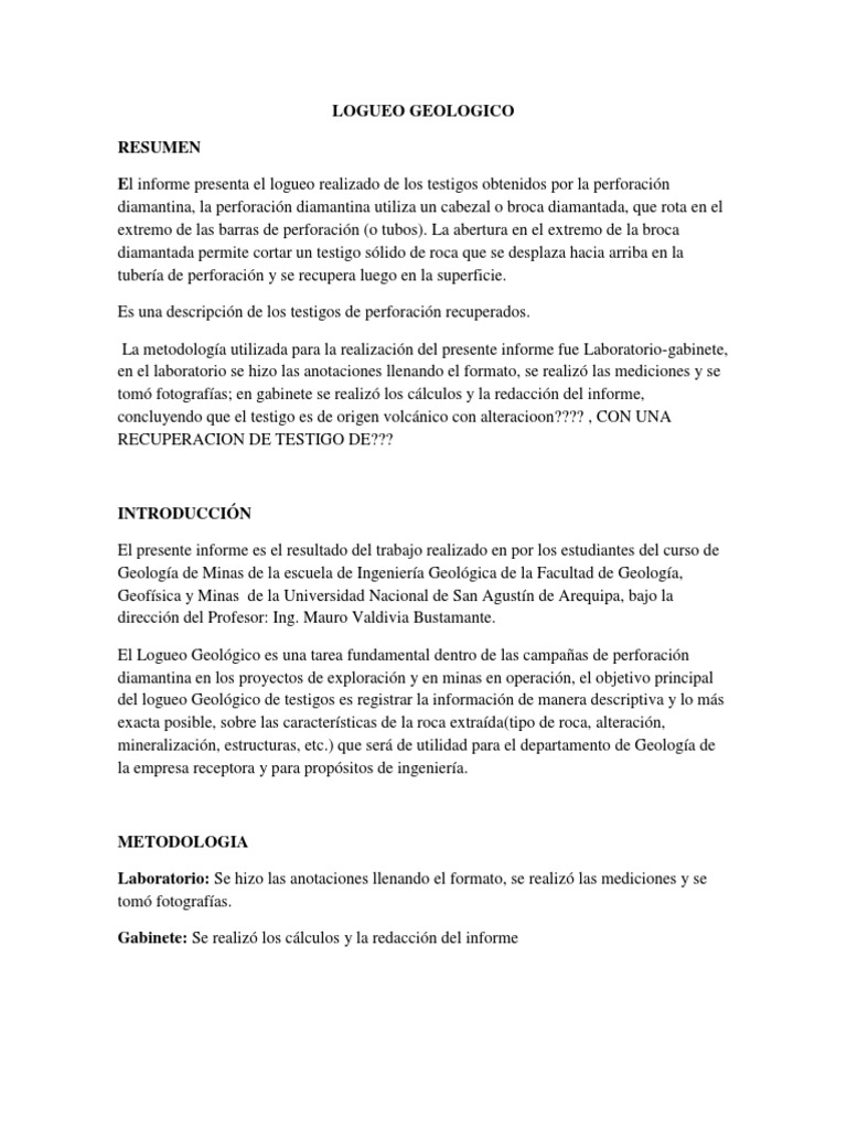 del logueo Geolgico de testigos es registrar la informacin de manera descriptiva y lo ms