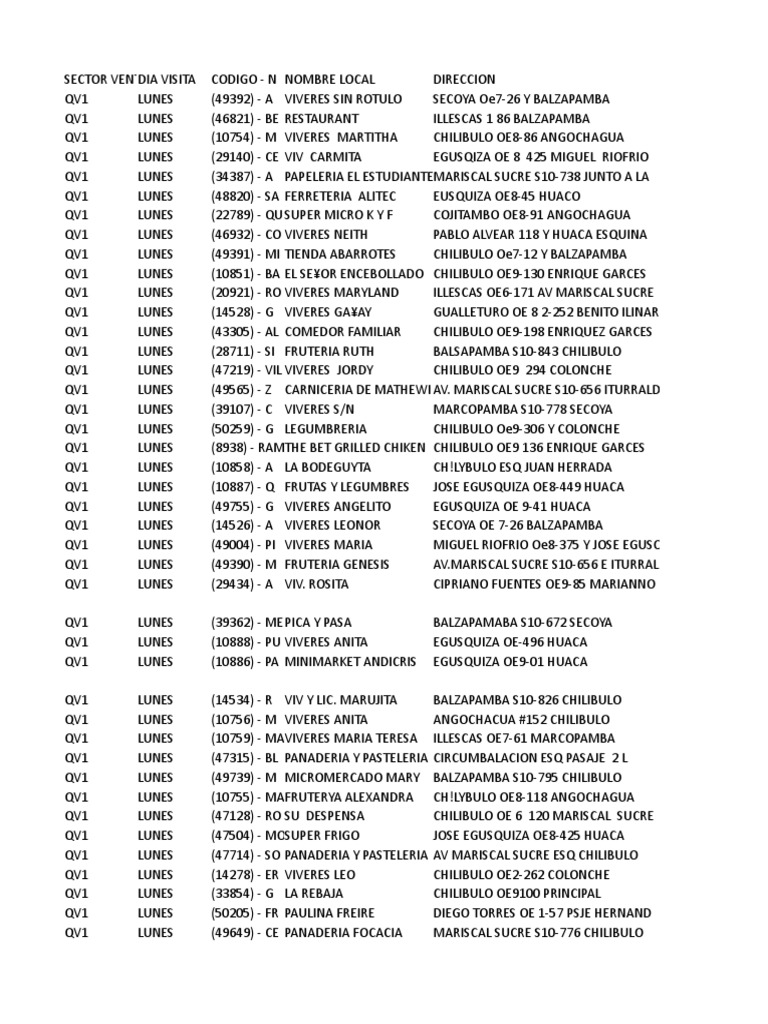SECTOR VENTDIA VISITA CODIGO - N NOMBRE LOCAL DIRECCION