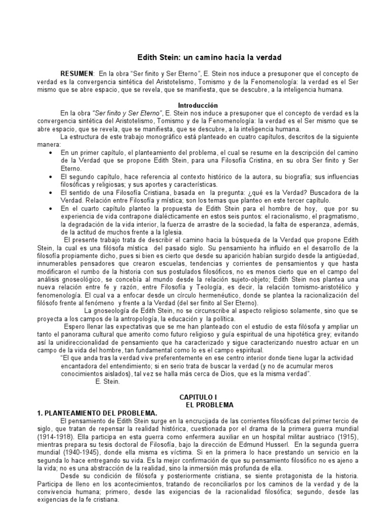 En la obra “Ser finito y Ser Eterno”, E. Stein nos induce a presuponer que el concepto de verdad es la